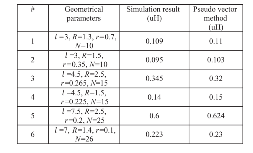 表一列出了仿真和伪向量方法之间的比较。我们比较了几种具有不同几何形状的电感器的电感,l-总长度(mm),R-大半径(mm),R-小半径(mm)和N-匝数。模拟结果是在中频10(MHz)条件下提取出来的。