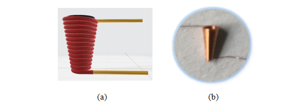 图3。DYTIV0101M0034N70-AB锥形电感器,采用粉末铁磁材料,26个线圈,直径0.24mm,外半径1.4mm,内半径0.1mm,总长度7mm。(a)宣传册的模型。(b)实物电感。
