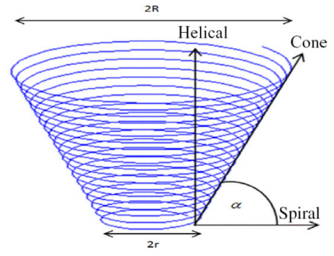 图1. 圆锥形电感器模型为螺旋和平面螺旋电感器的伪矢量和