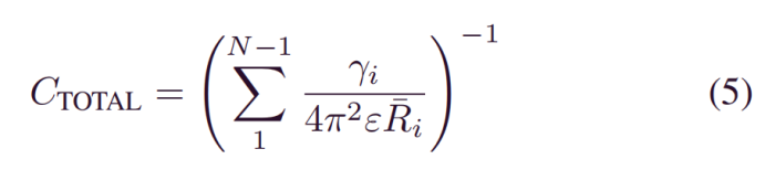 总寄生电容为N−1串联连接电容器的和。由于电容器的串行连接,N个环的总电容受到最小电容器值的限制。最小电容对应最小的环和第二小的环。因此,可以假定一个锥形电感器的总电容受到两者之间的电容的限制具有平均半径的最小环。