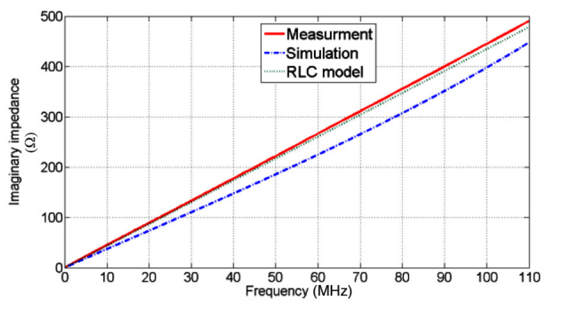 测量使用安捷伦4294A精密阻抗分析仪和一个在1 kHz-110 MHz范围内的夹具进行。图4显示了“DYTIV0101M0034N70-AB”电感器阻抗虚部的典型测量、模拟和RLC模型结果。测量、模拟和RLC模型的虚阻抗结果与电感器Im(ZL)= ωL的特性阻抗有很好的匹配。例如,用低渗透的粉末铁材料μ≈3制备的商业电感的测量电感为457(nH),模拟模型电感为435(nH)。5%的电感差异是由于核心磁性材料的模型不准确,假定其实磁导率高达150 MHz。表I #6显示了与图3(a)所示相同的电感器,但没有磁芯。因此,RLC模型图对应于RLC模型,如图2所示,其中L = 690 [nH],C = 8.48 [fF],R = 0.043 [Ω]。准确的测量结果与模型之间仅有2%的偏差,这表明了模型的有效性。