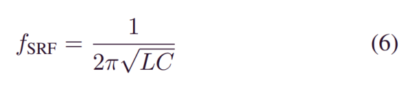 图2显示了一个简单的RLC模型,它描述了总数与电感器并联的寄生电容器。很明显,电感的带宽是由第一共振频率(Resonance Frequency)决定的。当频率高于第一SRF时,电感的无功部分开始作为电容器工作,不能再用作纯电感。以平行平面对称排列的两根相同导线之间的电容为[5]: