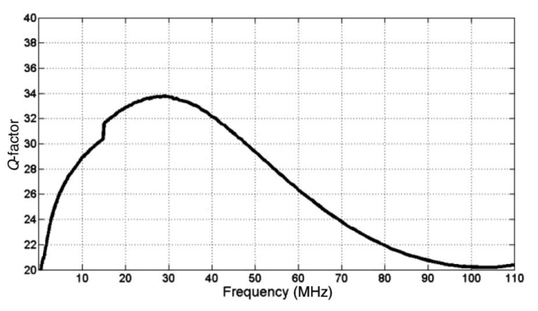 通过检查电感器的质量因子(Q因子),可以观察到频率相关电阻的膨胀R (f),如图6所示。在高达30 MHz时,电感器的Q因子随频率线性增加,这表明电阻与频率的依赖性较弱(主要是由于皮肤和接近效应)。在较高的频率下,q因子开始下降,由于强电阻与频率的依赖性(金属化和磁芯损耗)。然而,在90MHz,q因子达到一个恒定的值。